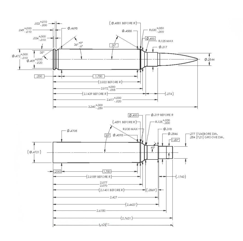 It uses standard brass cases and has to operate at lower pressures (approximately 65,000 psi), which limits its velocity potential, especially through shorter barrels.