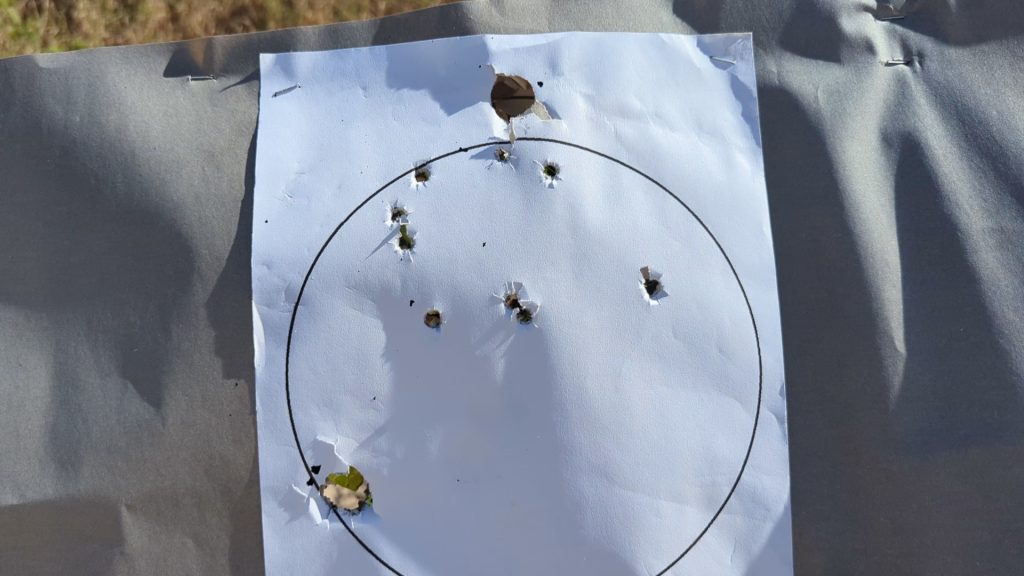 Here’s what standard OO buckshot looks like at ten yards in an 8-inch target. All the pellets land where I want them.