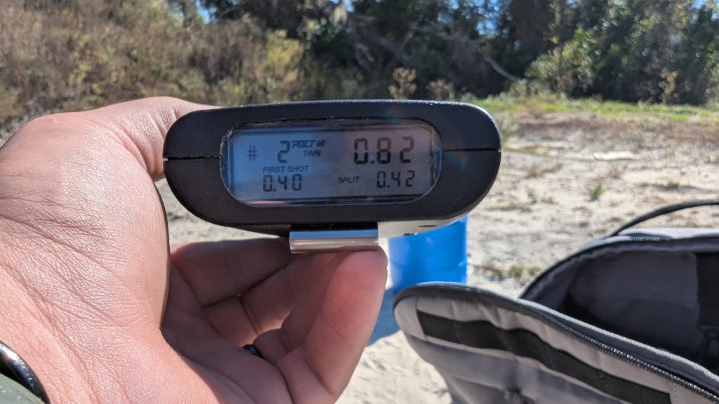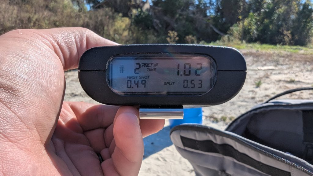 I could put two No. 4 buckshot rounds on target in 1.02 seconds. With standard reduced-recoil buckshot, I could do that in .82 seconds. Those numbers don’t matter as much as the split time score, which is .11 of a second and shows the true difference the recoil makes. The overall time factors into a low-ready presentation, which can be easily variable.