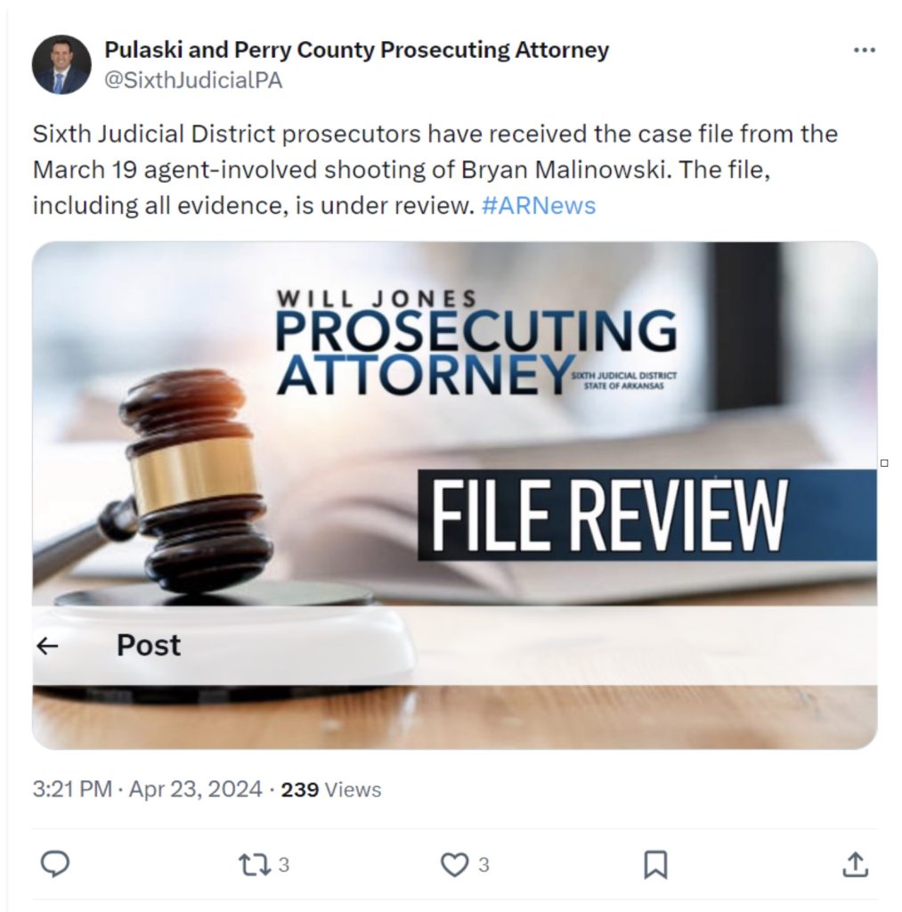 The Arkansas State Police Criminal Investigation Division (CID) investigated the Malinowski shooting. However, Arkansas State Police Director Col. Mike Hagar made a chilling statement late last month after his agency finished its investigation and sent the case to Sixth Judicial District Prosecuting Attorney Will Jones.
