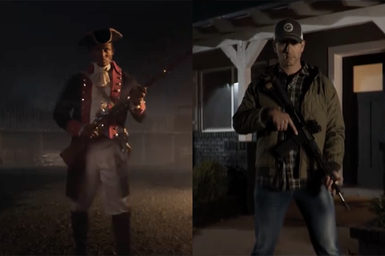 Sig Sauer’s ad juxtaposes colonial Minutemen with a modern homeowner holding an AR-15 and a voiceover that states, “Our freedoms…have been challenged before, yet they have stood the test of time. Today, our freedom is once again in question, and its future is not promised.” The comparison clearly evokes armed civil conflict: Americans believe that revolution against British tyranny was warranted, and the ad not only suggests that there exists a similar threat of tyranny today that requires an armed response, but offers a Sig Sauer AR-15 as the tool for that response to tyranny.