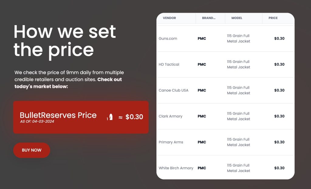 As of this writing, that price was $.30 per round. Bullet vault continually scans scores of online retailers’ prices for brand name, American-made 9mm FJM ammo to keep its “BulletReserves” price current.