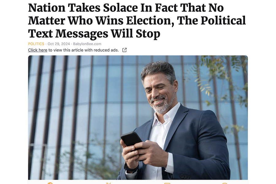 The Babylon Bee, my favorite place for “fake news you can trust,” may have – once again – summed up the general mood of the country with this headline: “Nation Takes Solace In Fact That No Matter Who Wins Election, The Political Text Messages Will Stop.”