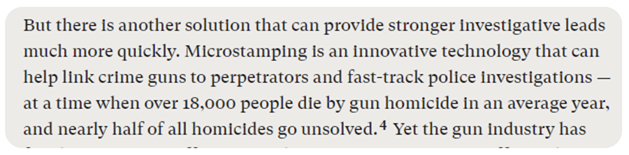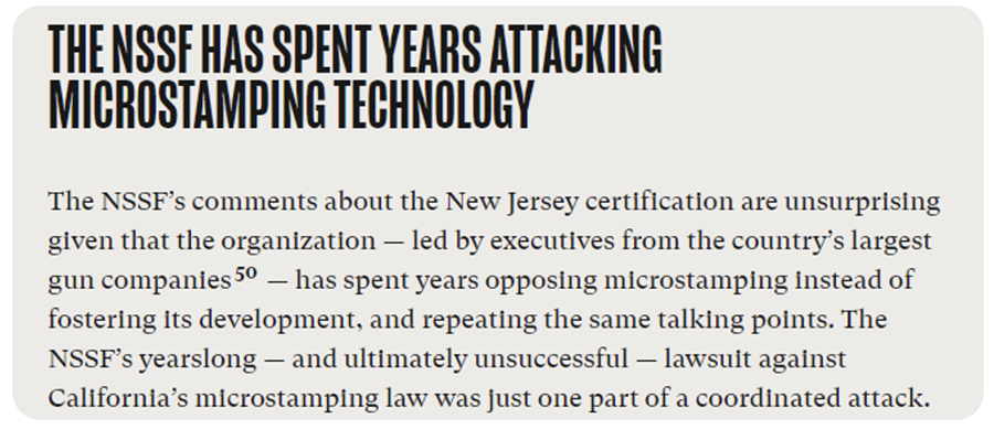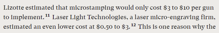 Finally, I want to touch on the running theme of this whole problematic article, which is that microstamping is possible but that evil gun companies, the NSSF, and the NRA are undermining it by refusing to go along with implementing the technology. The entire last third of Everytown’s article focuses on this point.