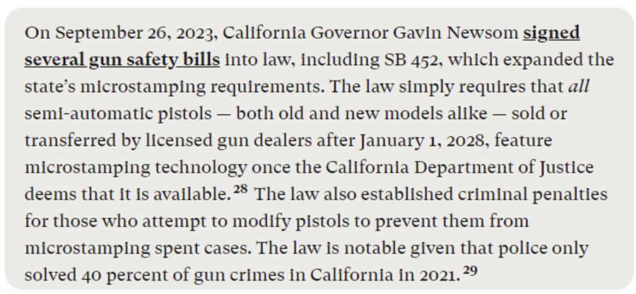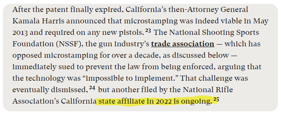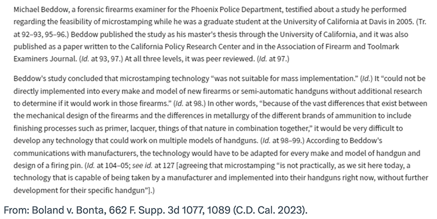At California Rifle & Pistol Association’s preliminary injunction evidentiary hearing in Boland v. Bonta, we presented an expert witness to discuss why mass production of microstamped firing pins was “not suitable for mass implementation.” The state failed to present anyone to argue the opposite, including the people Everytown cites in this report.