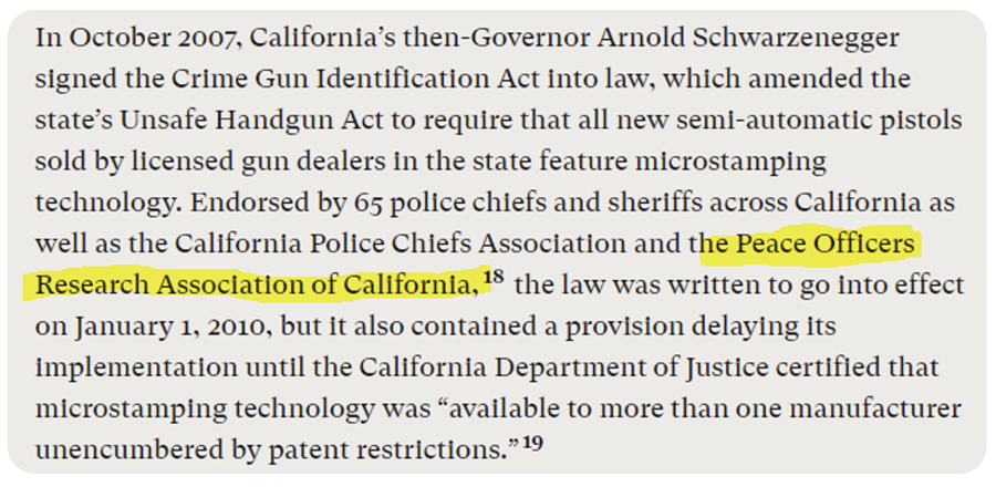 That is a strange inclusion in the article because PORAC is now on the other side. Whatever the reasoning for their 2007 position may have been, they wrote in an amicus brief in support of CRPA in Boland stating that: “the UHA’s microstamping requirement has little impact on deterring individuals who commit crimes with firearms, as they typically use stolen firearms” and that “microstamping—even if actually in existence—would provide little assistance to law enforcement.”
