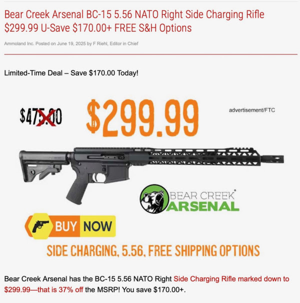When I clicked the link on the ad, after a double take, I realized why he was asking. The link took me to an Ammoland advertisement offering a Bear Creek Arsenal BC-15 5.56 NATO Right Side Charging Handle rifle for…$299.99 with “FREE Shipping Options.”