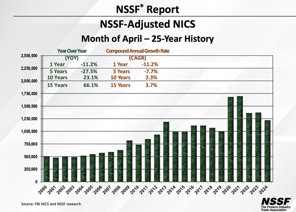 The April 2024 NSSF-adjusted National Instant Criminal Background Check System (NICS) figure of 1,216,116 is a decrease of 11.2 percent compared to the April 2023 NSSF-adjusted NICS figure of 1,369,296. For comparison, the unadjusted April 2024 FBI NICS figure 2,240,434 reflects a 14.4 percent decrease from the unadjusted FBI NICS figure of 2,616,729 in April 2023.