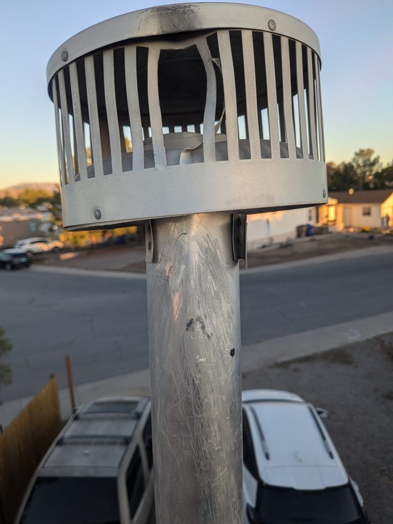 What goes up must come down, and this time it struck the spark arrestor on my water heater’s exhaust. It didn’t pierce the top, so I don’t have to worry about rain, but it knocked it loose from its mount, tore one of the bars out, and punched a nice-sized hole in the lower part of it.