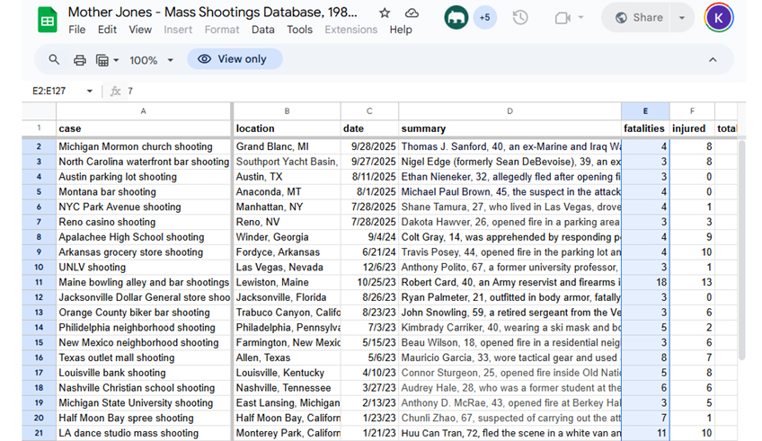 To summarize, the most expansive measure is the one used by the Gun Violence Archive, which counts any incident where four or more people are shot (not including the shooter) as a “mass shooting.” That leads to a tally of hundreds of “mass shootings” each year which are, in reality, personal disputes or gang violence, and not situations where an active shooter walked into a public place with the goal of killing as many random people as possible. For example, the current most recent entry is dated December 14, 2025, and involves four people injured in a shooting in a hookah lounge parking lot following a fight that broke out between them.
