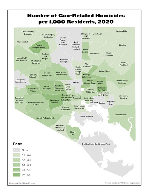 But that’s not actually a good description of reality. For any given set of laws, there are all sorts of other factors that will massively increase or decrease crime rates without changing the law. And that means that laws-on-the-books probably aren’t a major factor for determining actual, on-the-ground levels of violence. Here’s a neighborhood-level map of murders in Baltimore:
