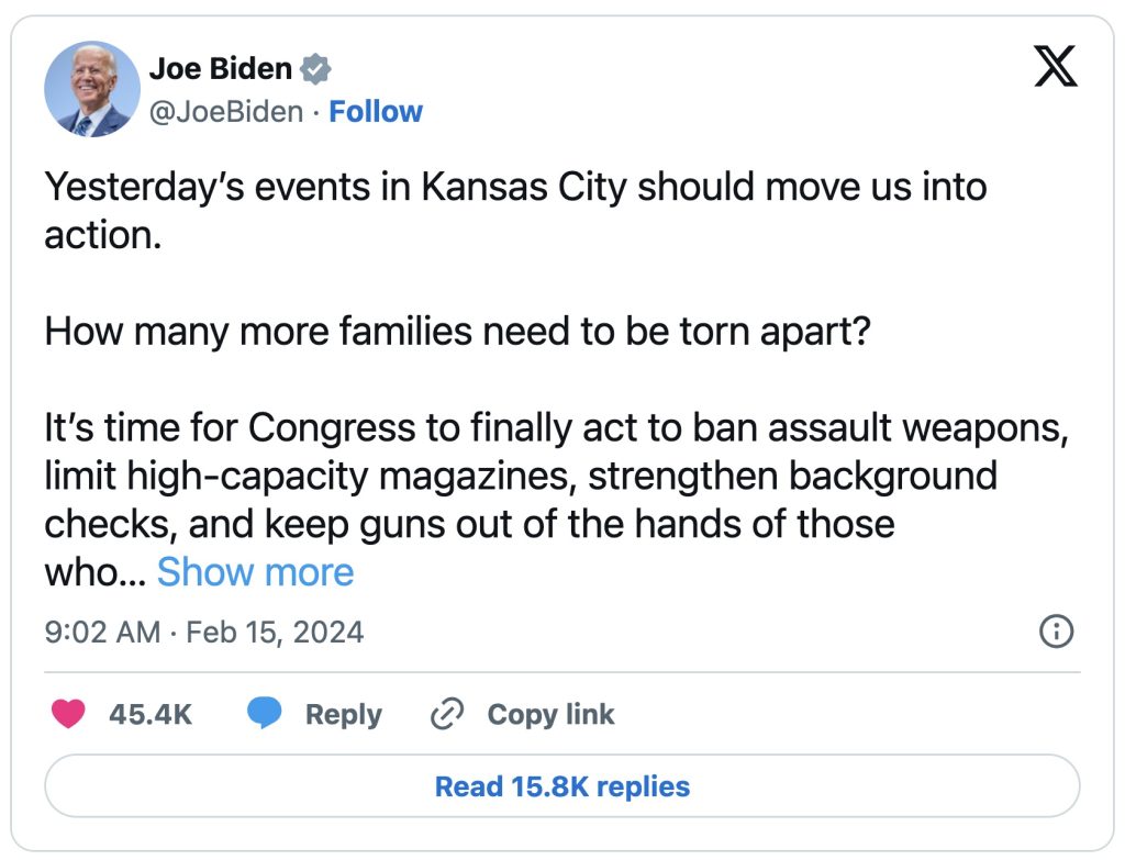 But when something happens like the Kansas City Super Bowl parade shooting, popular culture, famous athletes, and major media outlets come demanding of these people that they have to curtail their rights, because poorly-run, broken, dysfunctional cities in which they have no say and no power can’t get their shit together. When the leaders of those cities constantly talk down to them and despise them, no less?