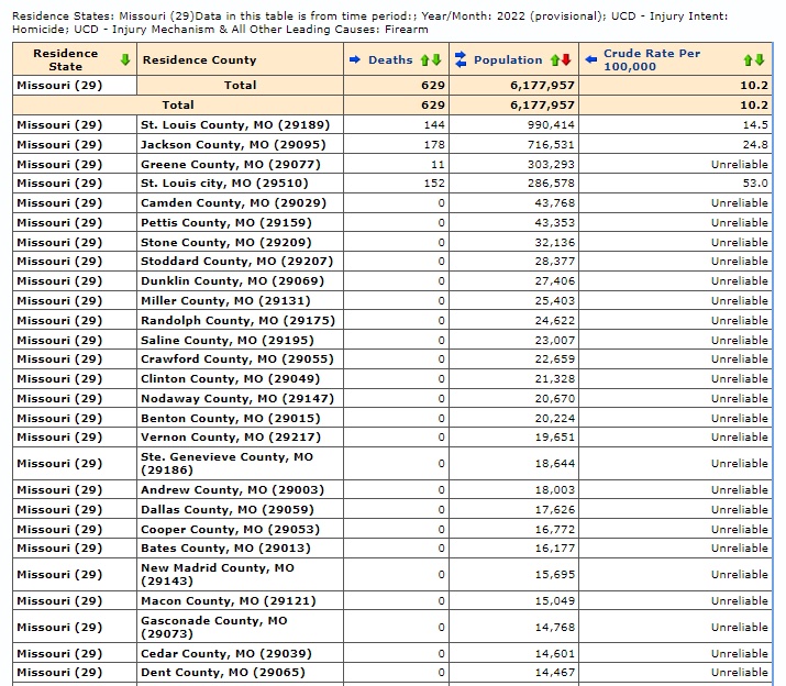 If Kansas City and St. Louis combined to form their own state with their 2.2 million total people, they’d have a gun-related homicide rate of 23.7 per 100,000 people. The rest of Missouri, with a remaining population of over four million people…just 3.7 per 100,000. About six times less.