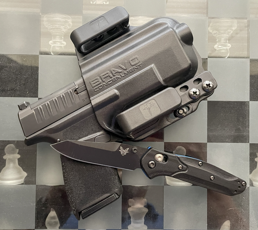 However, carrying a striker-fired in AIWB is a bit different than hammer-fired, or OWB, or such. SFAIWB presents a situation in which the muzzle, by nature of its positioning, is pointed at the bearer’s manfruits or femoral artery when in a seated position (think driving, working at a desk, sitting in church). Of my two primary EDCs, one has an integral trigger safety lever (CA model gun), and the other does not (non-CA roster gun). The latter offers a superior trigger and higher round count in its mag, but has no safety when carried AIWB. When I carry the former, the thought of an ND while seated is never on my mind due to the trigger safety, but would always be a concern with the latter, so with that one I carry it “Israeli”.