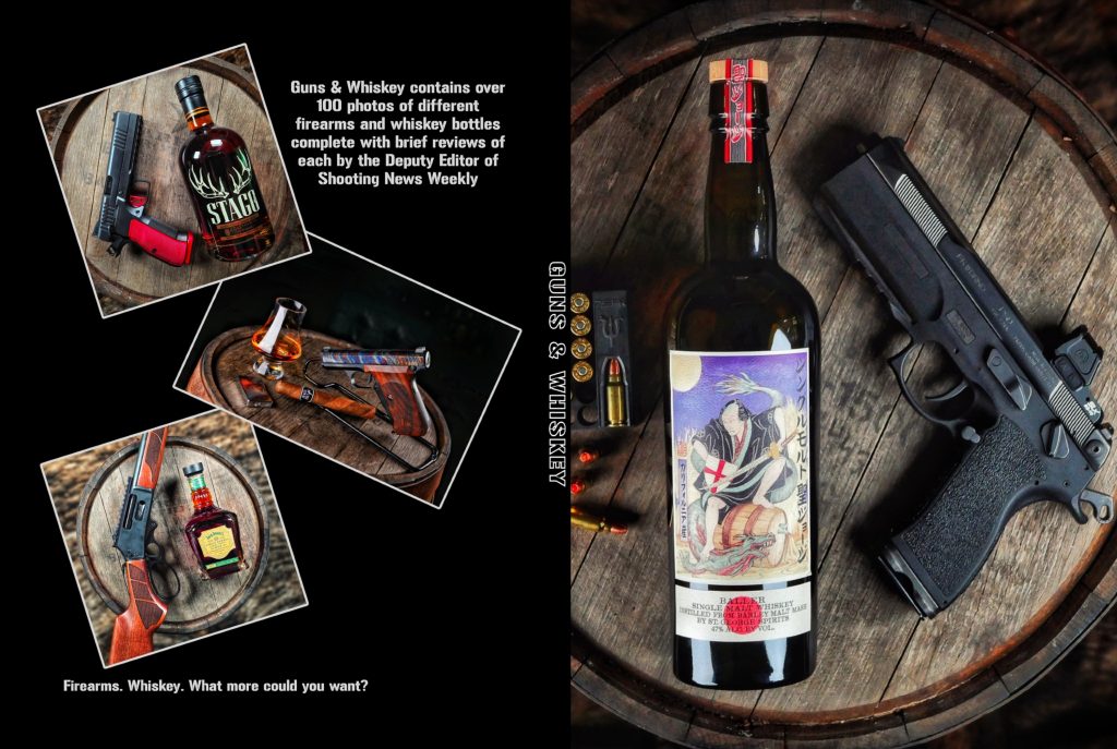 I took about 100 of the photos — each a different firearm paired with a different bottle of whiskey (bourbon, Scotch, Irish, Tennessee, and all the rest) — wrote a no-holds-barred review for every gun and every bottle, then compiled it all into a hardcover coffee table book called Guns & Whiskey.