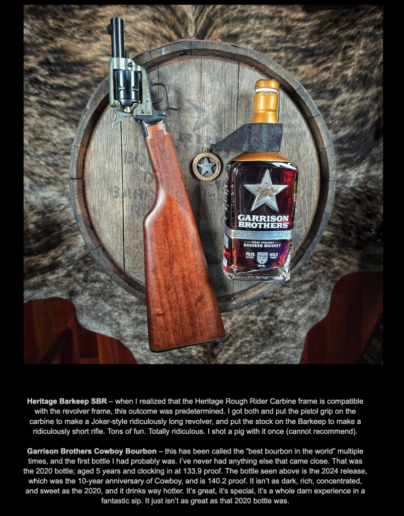 2. Guys who collect firearms have other hobbies and interests, and they tend to include one or more of whiskey, cigars, cars, BBQ, watches. I’ve spent a hell of a lot of time with “gun guys” in and out of the industry whether at trade shows, media events, hunting, competitions, etc. and, trust me, alcohol does go together with my people LOL. Just don’t be dumb, it’s drinking prior to shooting that’s an issue. Don’t worry, you can’t get drunk from photographs.