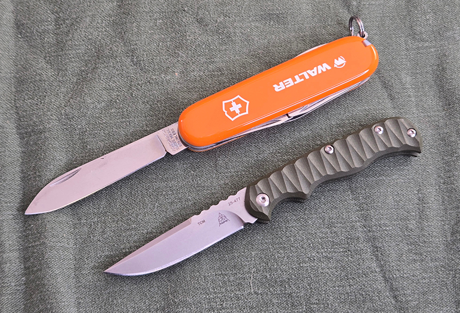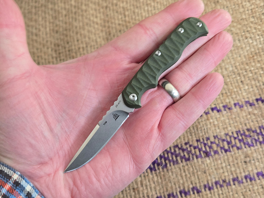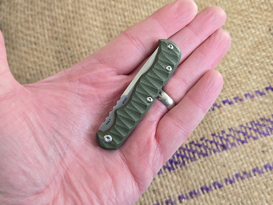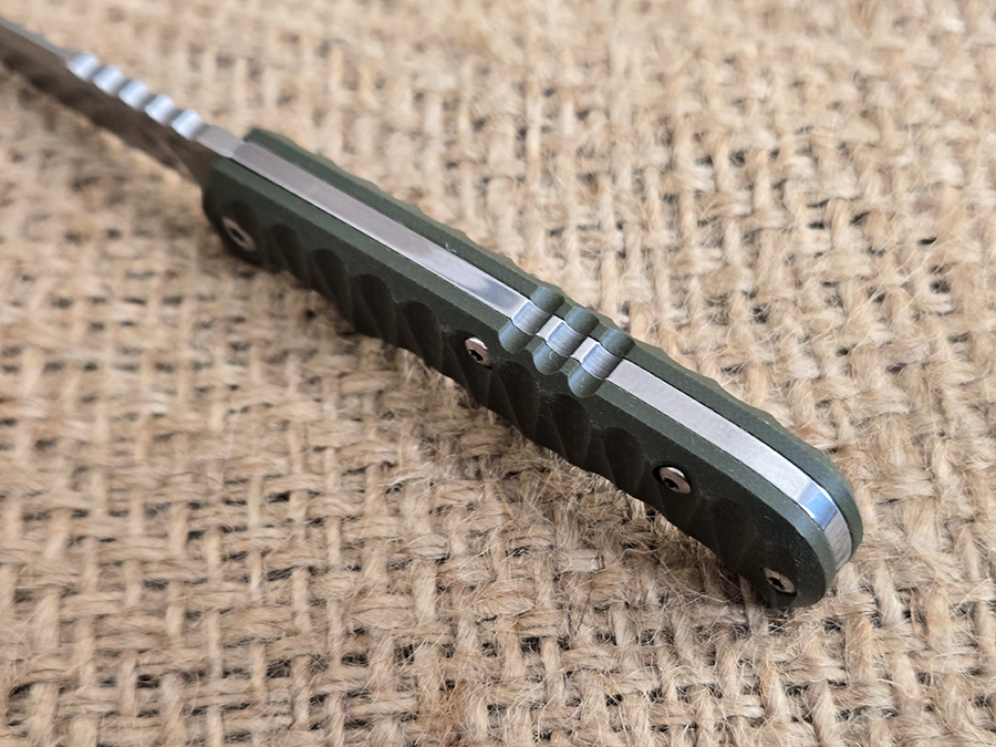 At just over five inches lone when open, the Tex Creek is a little smaller than a standard 91mm Swiss Army Knife, like a Tinker of Spartan. I can get a comfortable three finger grip on it. The textured G10 handle and jimping on the spine back strap give you a secure grip, even with the relatively petite size of the knife. The scalloped OD green G10 gives it a modern, not quite tactical appearance, but still works well with the traditional lines of the knife.
