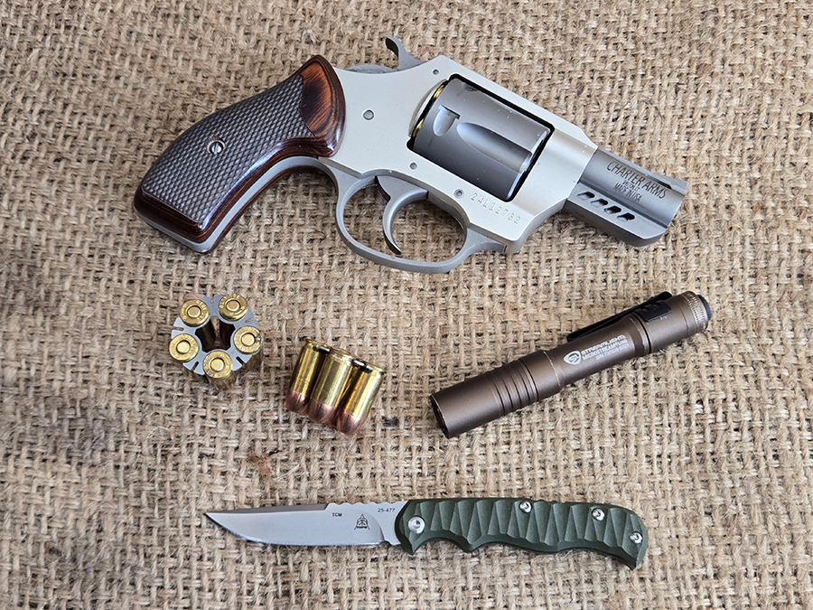 I mostly used it on conjunction with my lightweight EDC “kit” that consisted of my Charter Arms Coyote .380 ACP revolver, a couple of spare moon clips, and a Streamlight Microstream flashlight. The Coyote only weighs 14 ounces, and the Microstream 1.1 ounces. That makes for a pretty light overall loadout for a gun, 2 reloads, a knife and a light.