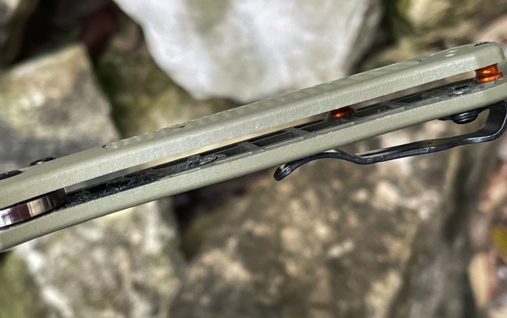 That’s amazingly light. It’s accomplished thanks to the Grivory (thermoplastic) scales Benchmade uses that have no liners. Instead, they’re molded with an internal grid design that gives them strength and rigidity.