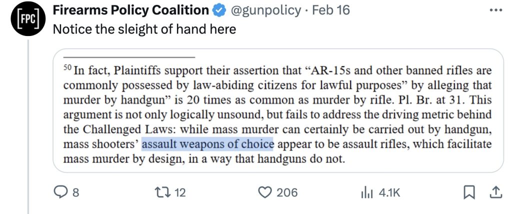 They don’t even bother to try to support their (demonstrably false) argument that the “assault weapons of choice” of mass shooters is “assault rifles.” It’s almost as if they’re not even trying.