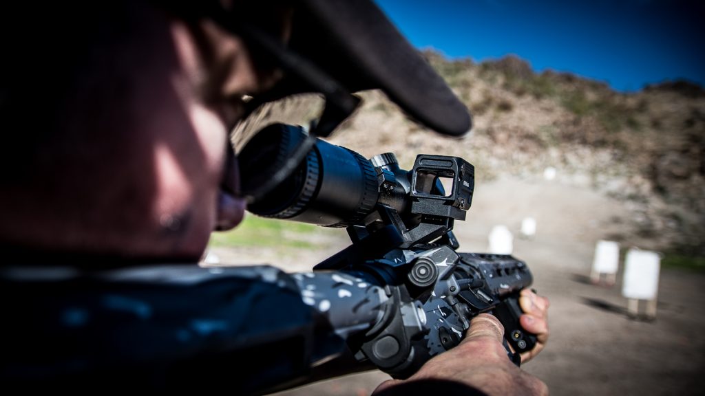 The age of the closed emitter optic is here. Viridian’s RFX45, shown on their PINCH offset mount, was right at home as a secondary rifle optic. (Photo: P. Erhardt)
