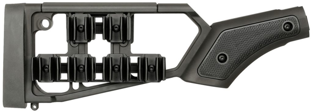 - Polymer cheek piece provides adjustability for use with iron sights, red dots, or magnified optics
