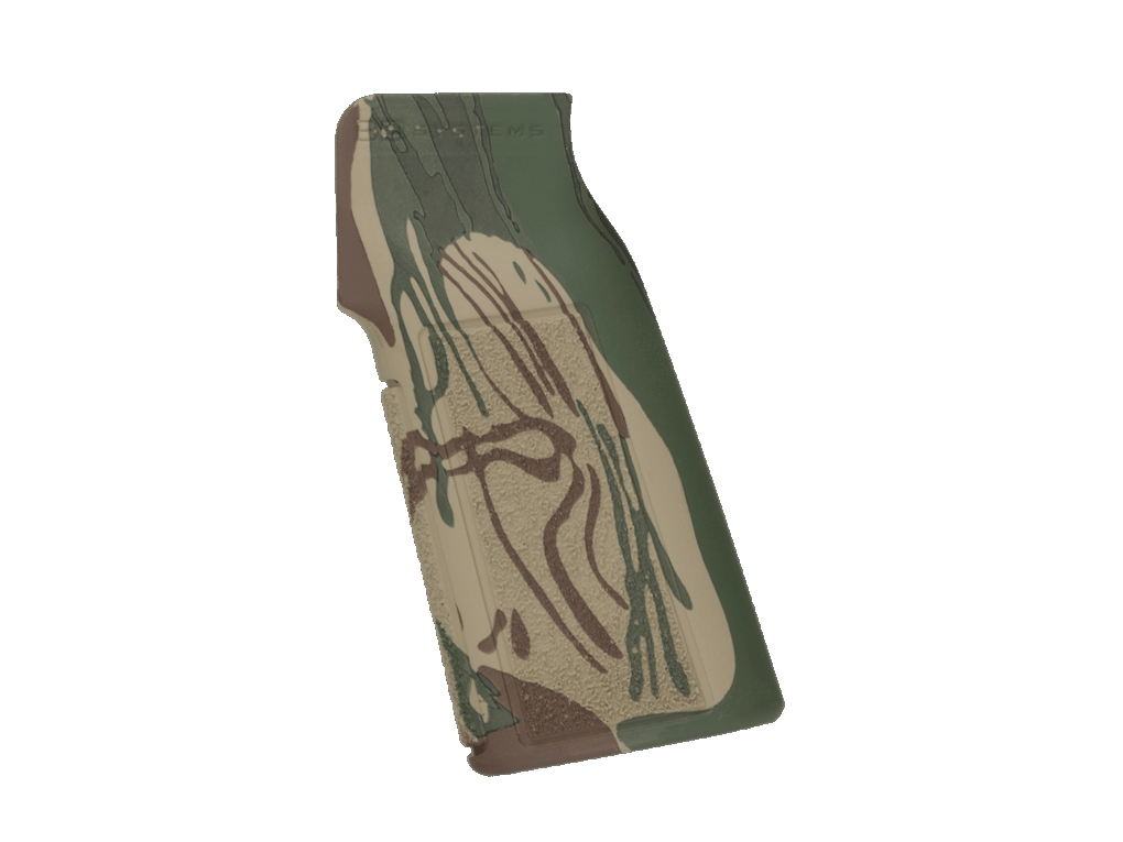 The Brushstroke camouflage consists of a three color, high contrast, disruptive pattern with green and brown strokes on a sandy background. B5 Systems applies that to their Bravo stock, P-22 grip and M-LOK handguard using a hydrodipping process. The Hydrodip provides for a durable, and even application with good wear qualities. MSRP for the full set is $109.