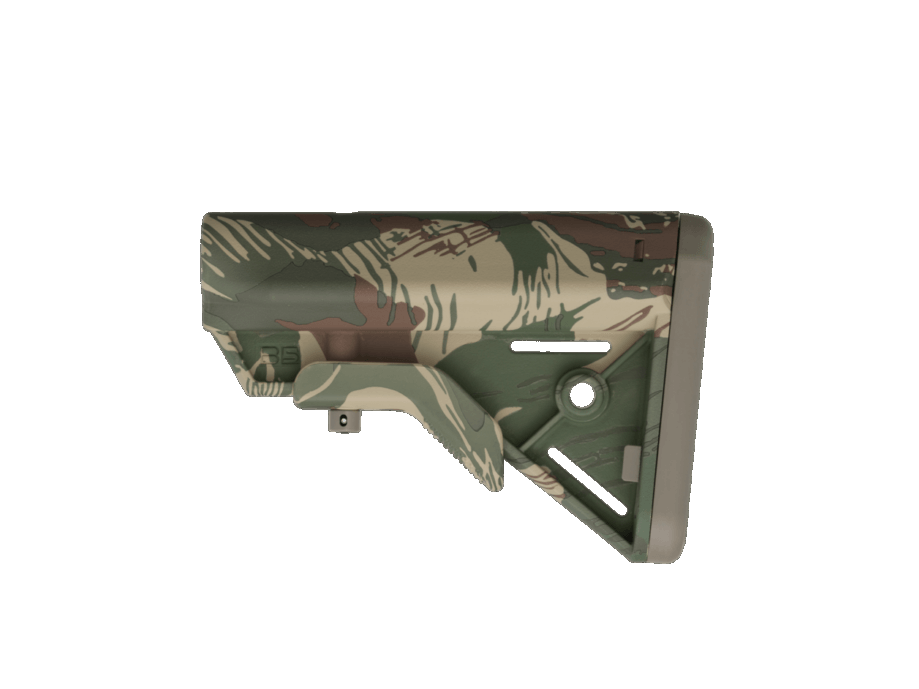 B5 Systems regular does drops of unique camo or color pattern stocks. Their latest is their Rhodesian Camo Collection, and it consists of a kit that includes a Bravo Stock, the textured and angled P-Grip 22, and the compact Vertical Grip M-Lok.