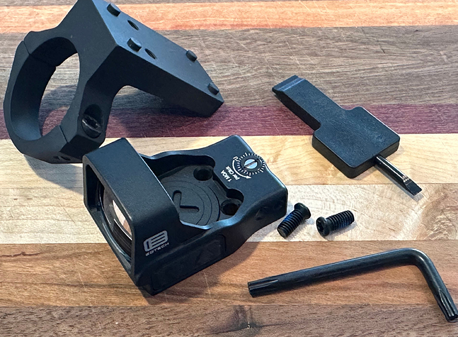 EOTECH has addressed the near to far issue with their “super short” 3-9X by offering the scope as a combo with their EFLX mini-red dot sight and a slick mounting ring for it. If you buy the combo kit, you get everything you need; EFLX red dot, aluminum ring mount, tool kit and CR2023 battery.