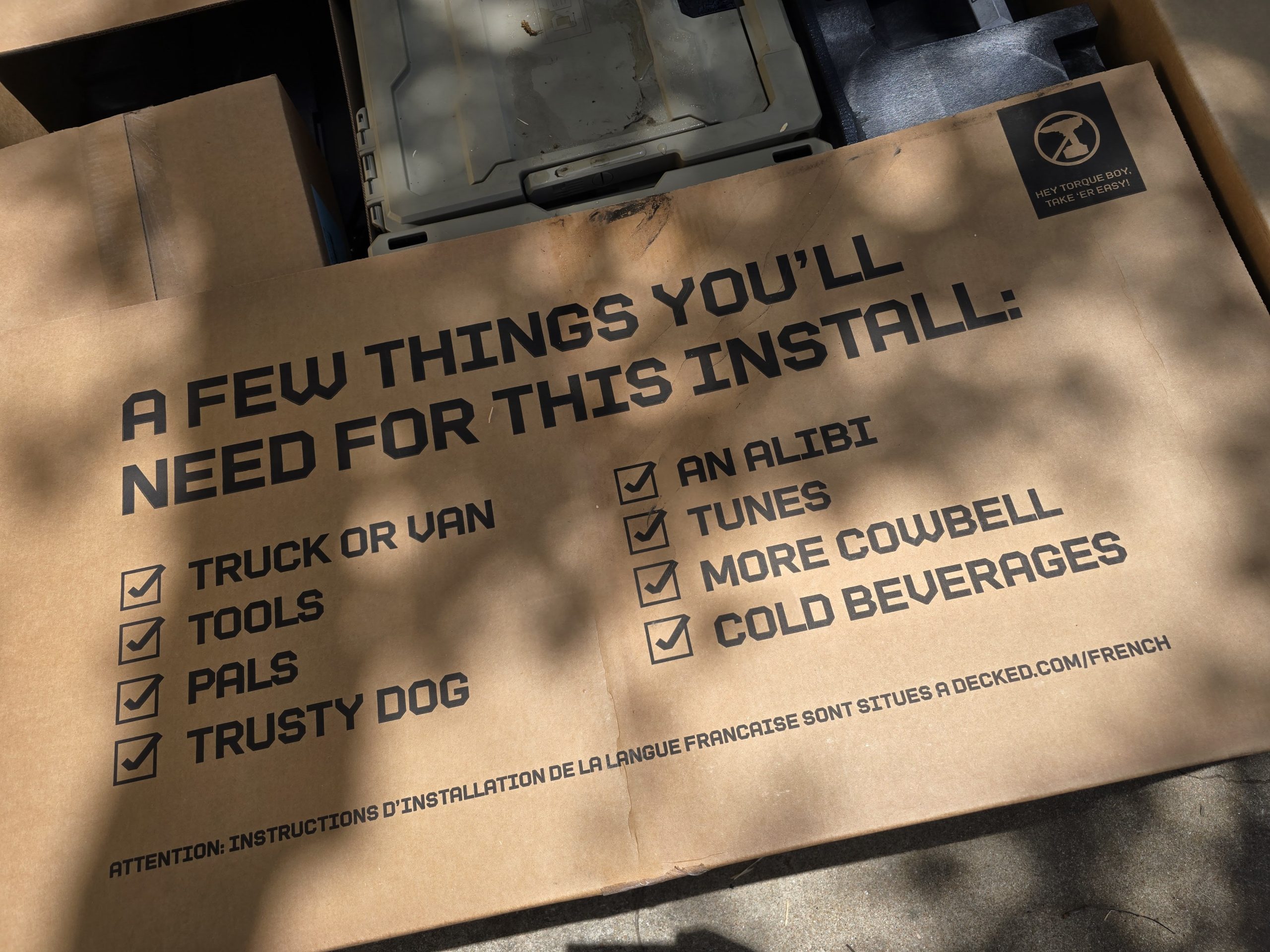 Start-to-finish it took me two-and-a-half hours to complete the unpacking, assembly, and installation of the DECKED system. I consider this pretty good as I did it quite leisurely and by myself. Actually, worse than by myself, by myself and distracted by children.