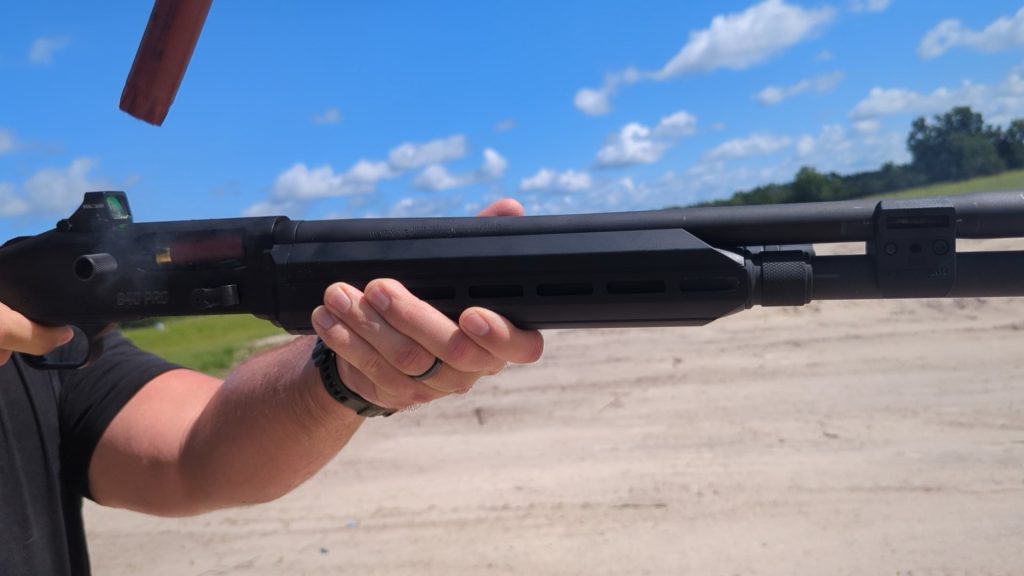 The handguard is made entirely of metal and is 10.5 inches long. We get six M-LOK slots on each side and the bottom. Which accessories do you mount to your shotguns? For home defense, I wanted a light, so I mounted a Surefire Scout Pro. I also wasn’t a big fan of the grip texture on the 940 Pro Tactical. No complaints here.