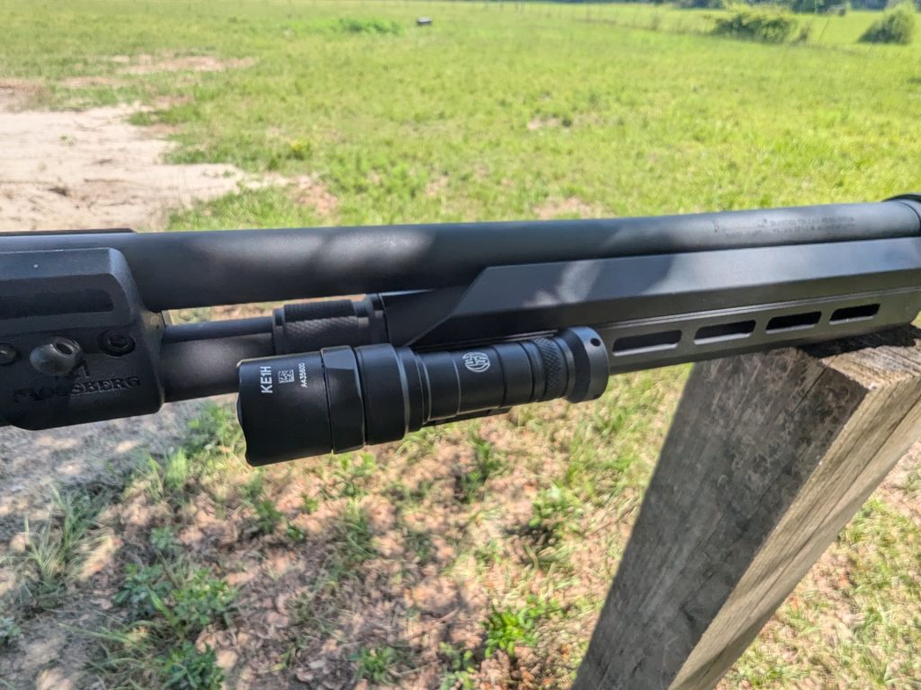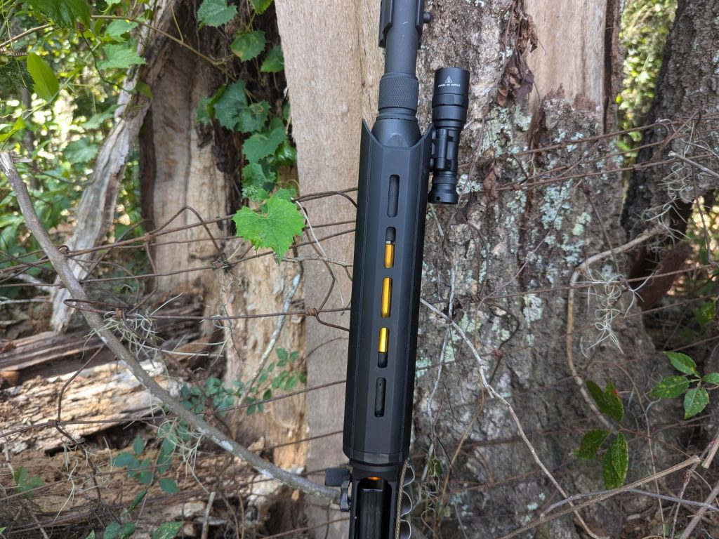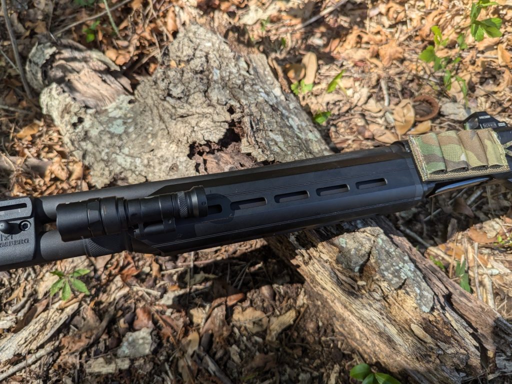 The Surefire Scout Pro that’s attached didn’t budge through a hundred rounds of full-powered buckshot, and I don’t know how many rounds of birdshot. It’s a tight fit, and a tight fit is what you need for a home defense light.