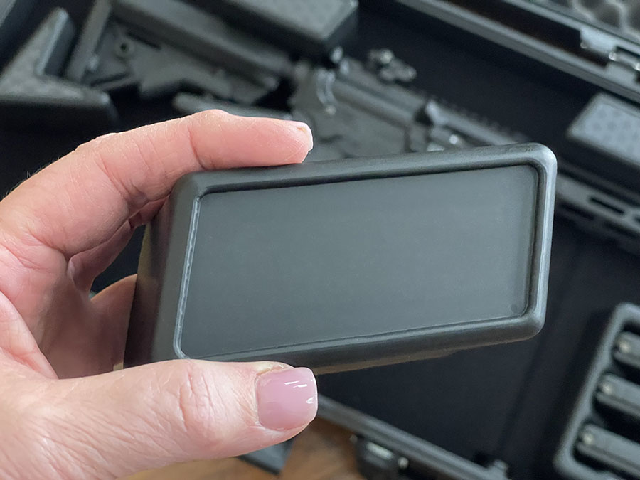 Next, the blocks. These are available in three shapes: pistol seat, diamond block and arrow, in sets of four. Again, with more shapes coming. Designed to absorb shock, the blocks are easy to pull off and move around for different configurations. I spent time setting up a 42-inch Plano case in various configurations, using rifles with and without scopes, trying to determine the most secure variations. Let’s just say the options are limitless.