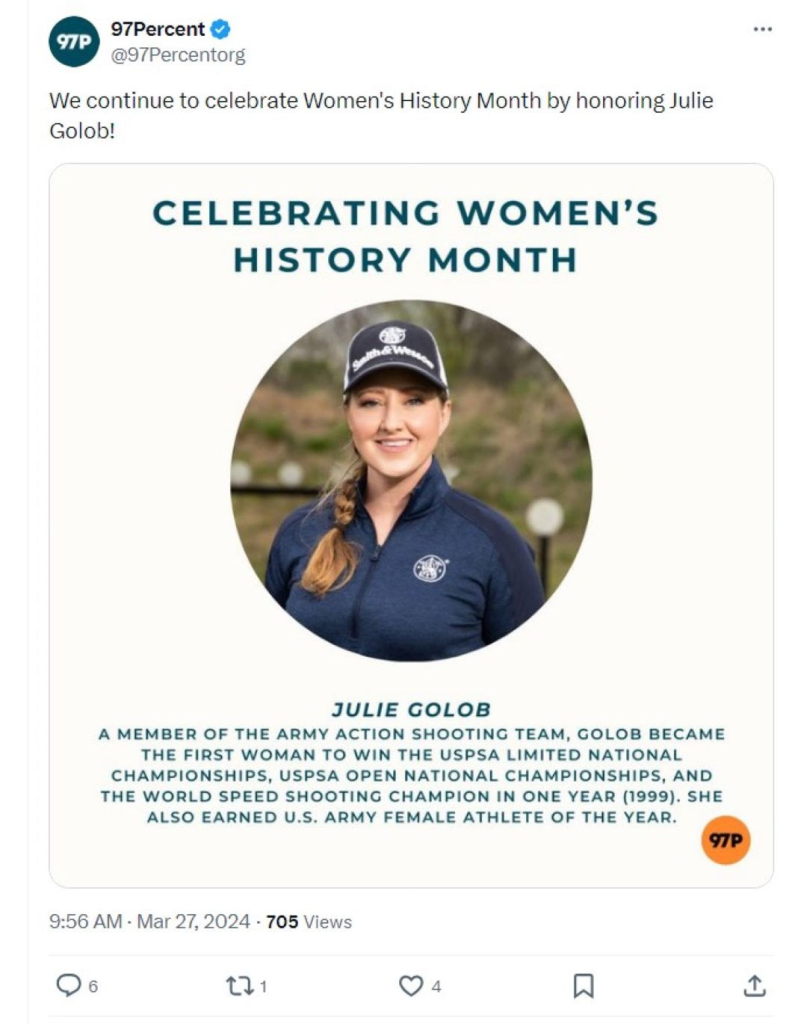 This is the busiest time of year for professional shooter, wife, mother and Army veteran, Julie Golob. She is hosting classes and training hard for the upcoming competition season, which begins later this month. So she didn’t have much time to devote to a controversy that surfaced last week when her image and personal information were misappropriated for a social media post by the anti-gun group, 97Percent, as part of its campaign to gaslight the public into falsely believing it’s a moderate pro-gun group.