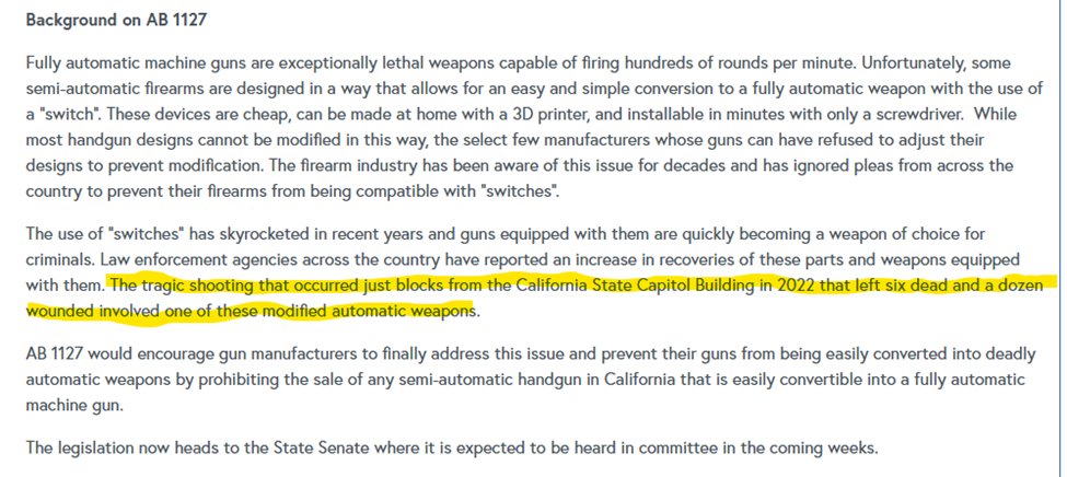 AB 1127 was sponsored by Assembly member Jesse Gabriel. In a press release about his bill, he references the Sacramento shooting in 2022 as prompting him to push the GLOCK ban.