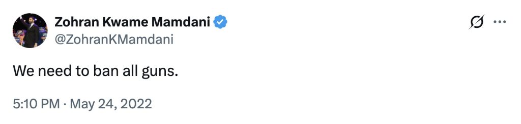 “We are reminded—no matter how strong our gun laws are in this state—we are only as safe as the weakest laws in this nation,” Mamdani claimed throughout his mayoral campaign. He even had it posted on his X account.