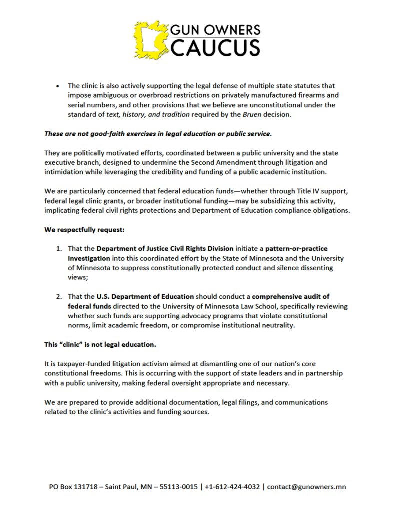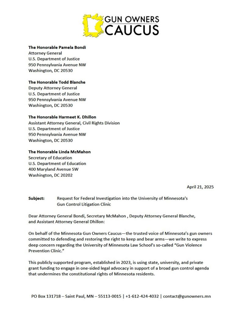 MN Gun Owners Caucus Asks DOJ & DOE to Investigate U of Minnesota Law School Over Its ‘Gun Violence Prevention Clinic’