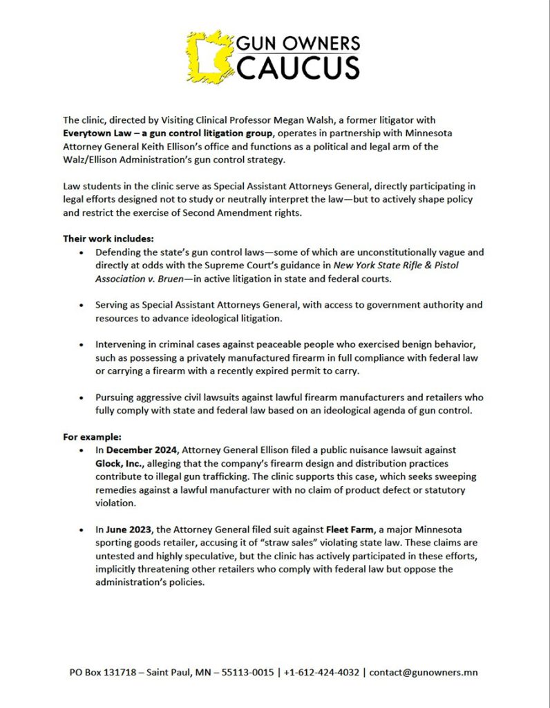 This “clinic” is led by a former litigator from Everytown Law, a gun control group. It operates in partnership with MN AG Keith Ellison’s office as a political and legal arm of the Walz/Ellison Administration’s gun control strategy.