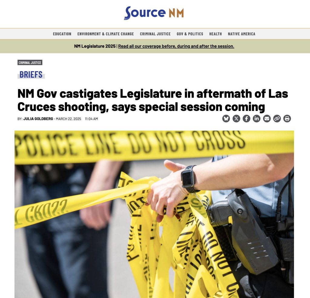 The governor’s special session tease came on the heels of a gang-related criminal shooting that happened Friday night at “an unsanctioned car show.” Las Cruces police have already arrested one adult and three teenagers and charged them with crimes involved in the shooting. The three teens are already barred from legally owning firearms so no existing or additional laws would change that.