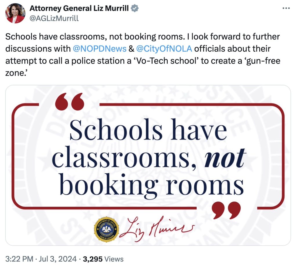 “I’m working hard to help keep New Orleans safe, but the City cannot avoid state law by unilaterally designating police stations ‘vo-tech locations.’ You cannot just ‘designate’ yourself a vo-tech school. Among other implications, if it was one (it’s not) the police department would be under the jurisdiction of a board of supervisors for higher education, and it would be subject to other oversight requirements. I have no specific plans yet, but would caution the NOPD that it will likely be subject to civil rights lawsuits under Section 1983 of the Civil Rights Act if it arrests people pursuant to its made-up designation, which is clearly not legal or effective. I certainly hope the NOPD isn’t violating people’s rights by making up their own rules, which is why the Department is under a federal consent decree,” Murrill said in a statement posted on social media.