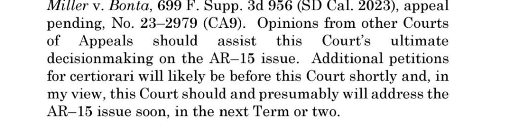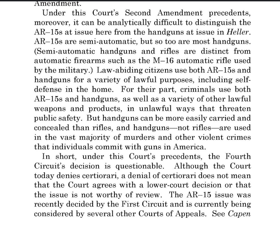 Justices Thomas, Alito, and Gorsuch would have granted. Justice Barrett, as usual said nothing. Justice Kavanaugh wrote a very unusual statement respecting the denial of the petition. The first two paragraphs explain why the Maryland decision was “questionable.” If you read these parts, you would expect a grant. Indeed, Kavanaugh as circuit judge had found that the District of Columbia’s ban on AR-15s was unconstitutional.