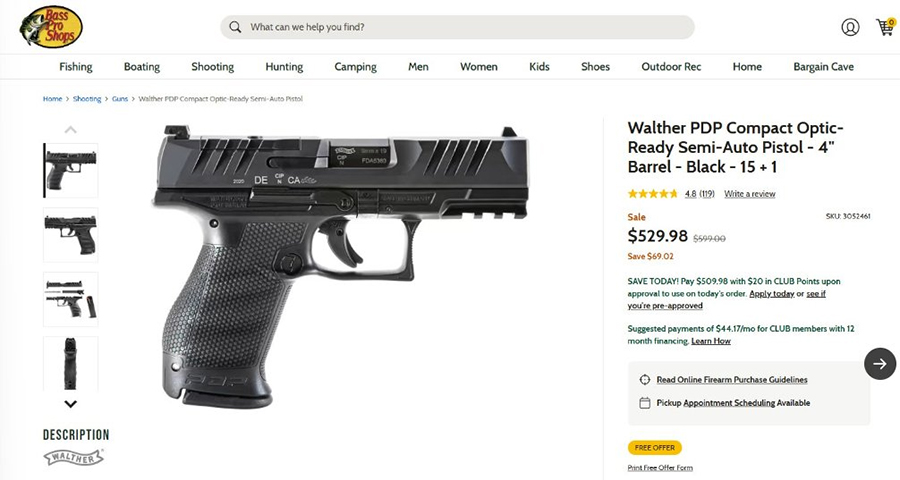 Bass Pro Shops, a major retailer that sells firearms, demonstrates this well on their website. As of December 29, 2025, a standard compact Walther PDP sold for $529.98, but when the California-compliant version is selected on the same webpage, the price jumps to $649.00. So already, our aspiring gun owner is paying about $119 more than she would in Arizona, Nevada, and most other states.