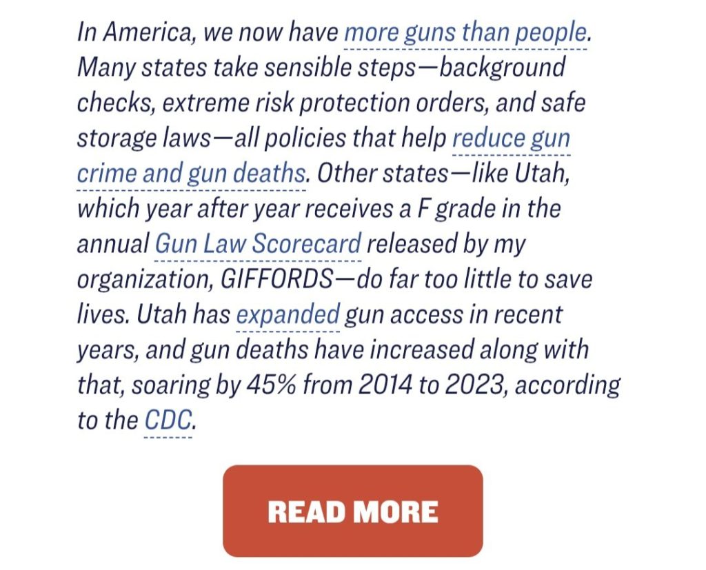 Giffords gives Utah an “F” it its annual grading system for its lack of gun rights restrictions, despite the fact that the state has the third-lowest homicide rate in the nation.