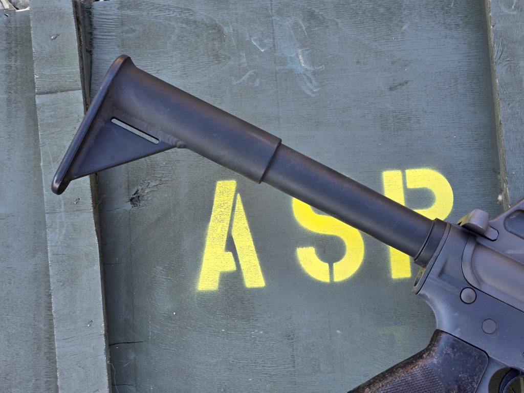 The American Icon kit consists of an aluminum receiver extension with buttplate. It’s all welded as one piece, and accepts a standard carbine buffer and spring, and CAR end plate. The buttplate has a sling slot located on the horizontal access. Of the original 10 or so 608’s made, we saw a few stock variations. There was a mix of the slot being in this position, or along the angled  portion of the stock support. I asked about what prompted the horizontal choice over the angle, and was told that the gun rides closer to the body with the horizontal sling slot versus the angled one. Makes sense, and both are equally accurate.