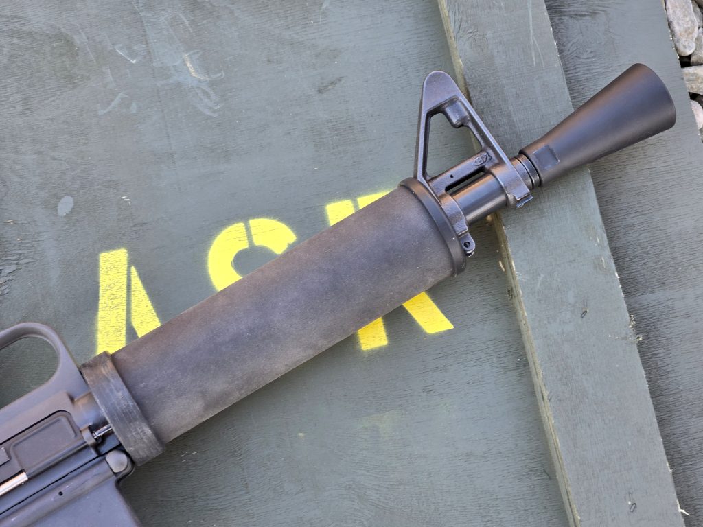Putting everything together was pretty straight forward if you’ve ever built an AR. Lower and upper assembly are just like any other AR. I used the H&R rear sight kit but I did cheat on one thing. I used an A2 rear aperture rather than the A1. I know, that violates clone correctness, but I prefer the bigger aperture on the A2, especially on a short carbine like this. My old eyes find the bigger aperture much easier to use than the tighter A1 rear sight.