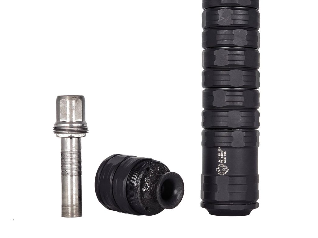 JK Armament considers their shotgun suppressors (and their JK 105 CCX 9mm suppressor) to be “special use” suppressors, which means they’re physically smaller than they’d truly have to be in order to reliably suppress the host firearm down below that 140 dB threshold without being run “wet.” The 195 series comes with Vaseline pre-applied inside the baffles in order to show the owner how much and where to apply it, and to ensure each owner experiences shooting the suppressor wet.