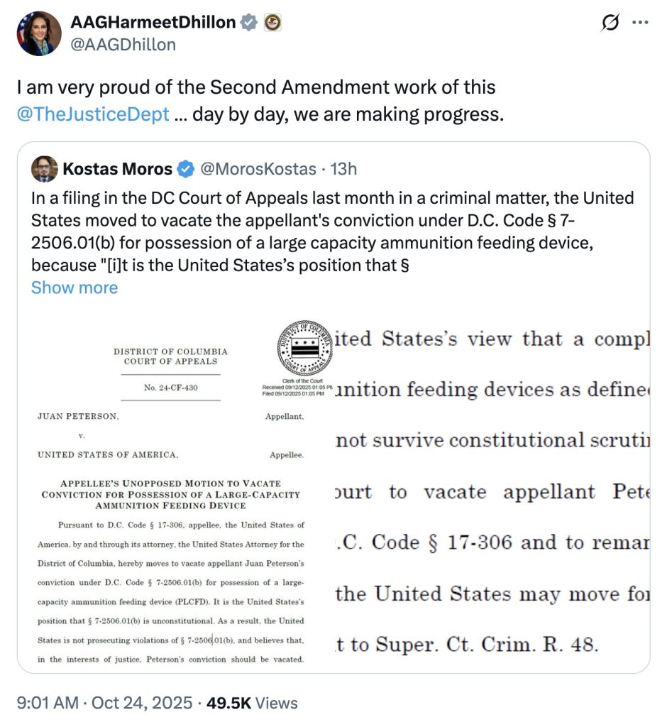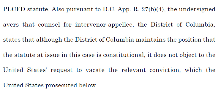 In a filing in the DC Court of Appeals last month in a criminal matter, the United States moved to vacate the appellant’s conviction under D.C. Code § 7-2506.01(b) for possession of a large capacity ammunition feeding device, because “[i]t is the United States’s position that § 7-2506.01(b) is unconstitutional.” The DOJ also says they would not charge a similarly situated defendant today.