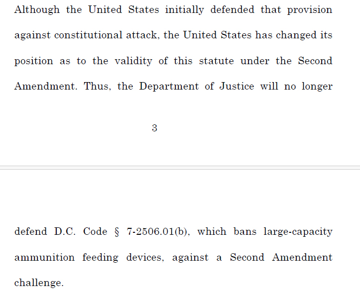 The United States, though, has changed its position and “will no longer defend D.C. Code § 7-2506.01(b), which bans large-capacity ammunition feeding devices, against a Second Amendment challenge.”