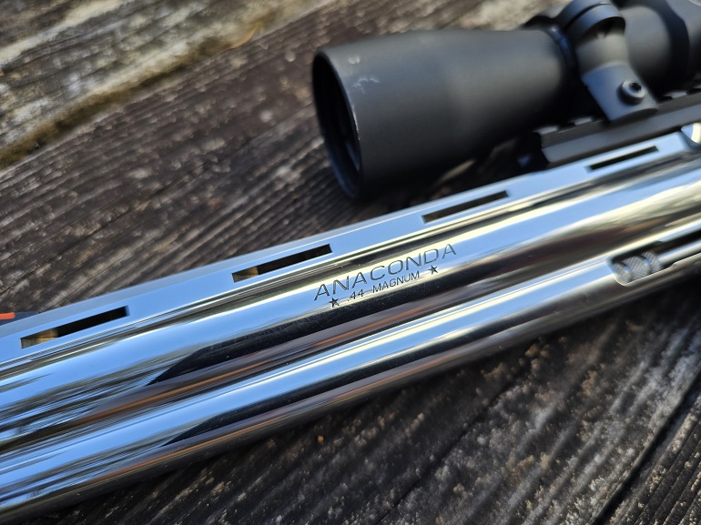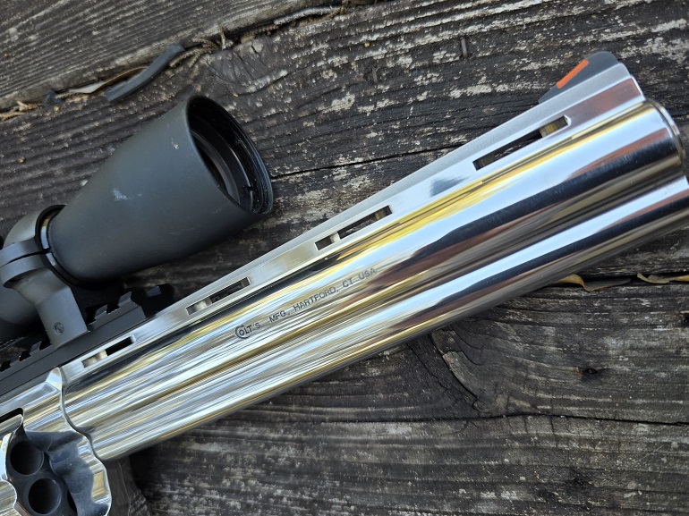 Even without the scope, the 8″ Anaconda is not a lightweight gun. Of course, with an 8″ barrel it’s not really designed to be carried on the hip, doubly so once it’s scoped. Like the originals, the 8″ Anaconda features a full-length ejector rod housing, putting considerable weight down to the muzzle. There’s also that long “vented rib” the series is so famous for and a stainless-steel frame even beefier than the old models. If anything, the Anaconda is overbuilt and can take a steady dose of heavy bullets at speeds some other wheel guns just can’t handle.