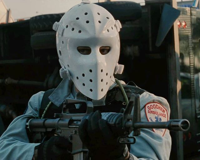 The first would be a setup from the armored car robbery. The crew wears grey jumpsuits, HRM Tactical vests, and goalie masks. A grey jumpsuit or coveralls would be an easy find. The HRM Tactical vest is a bit tougher.